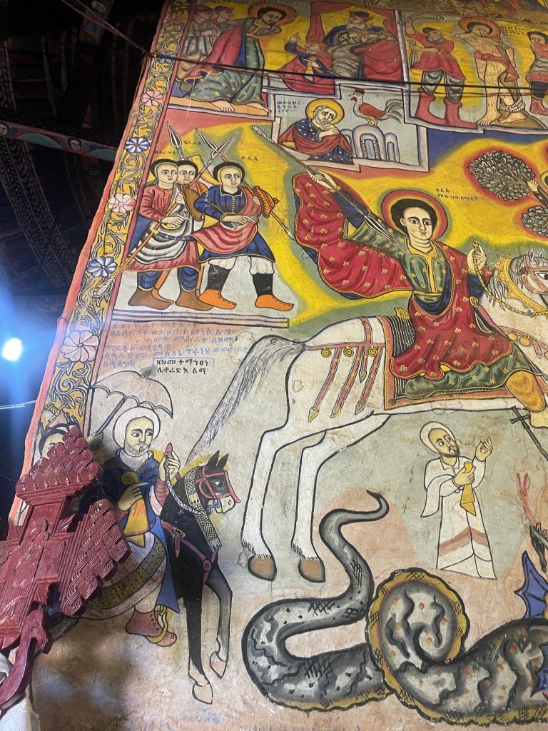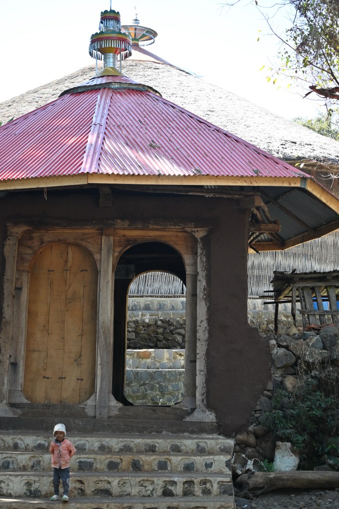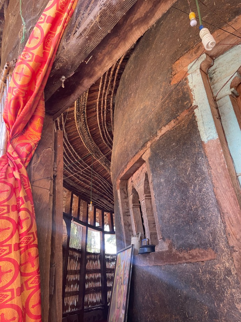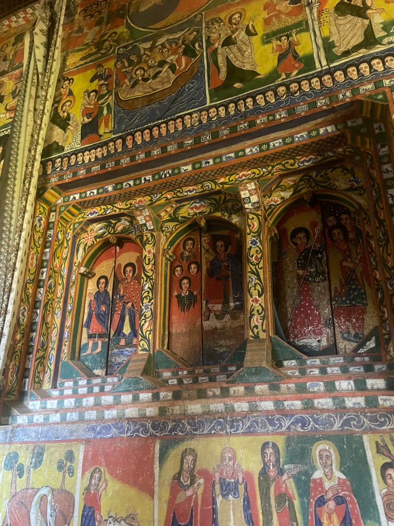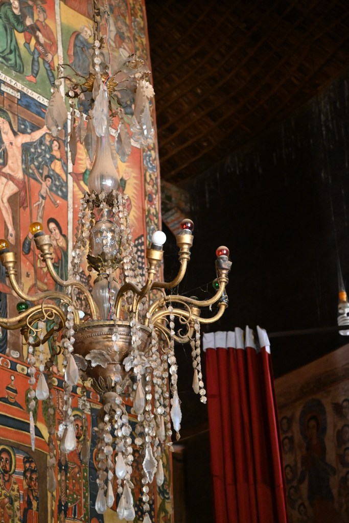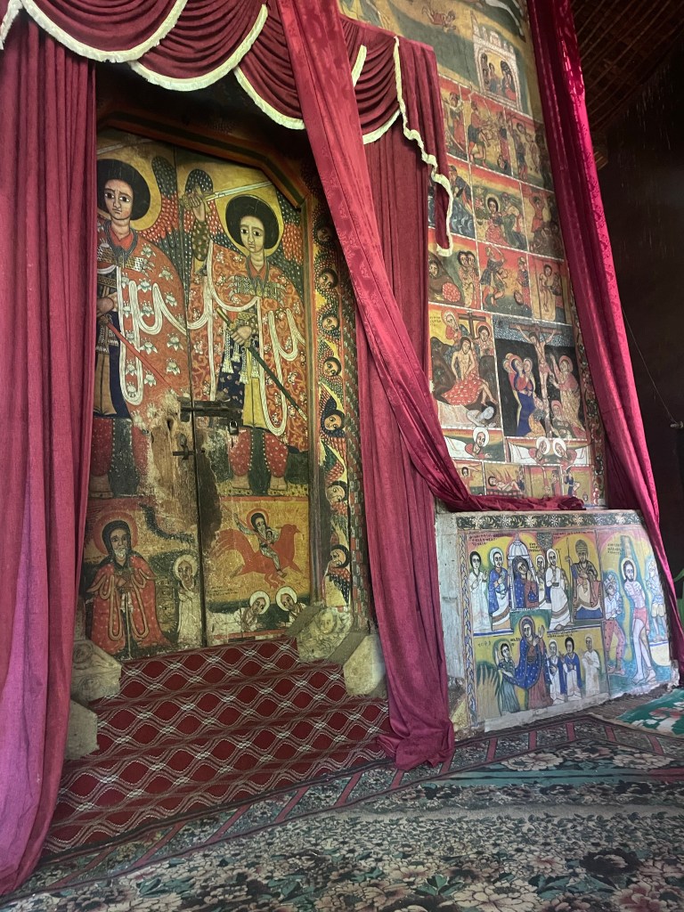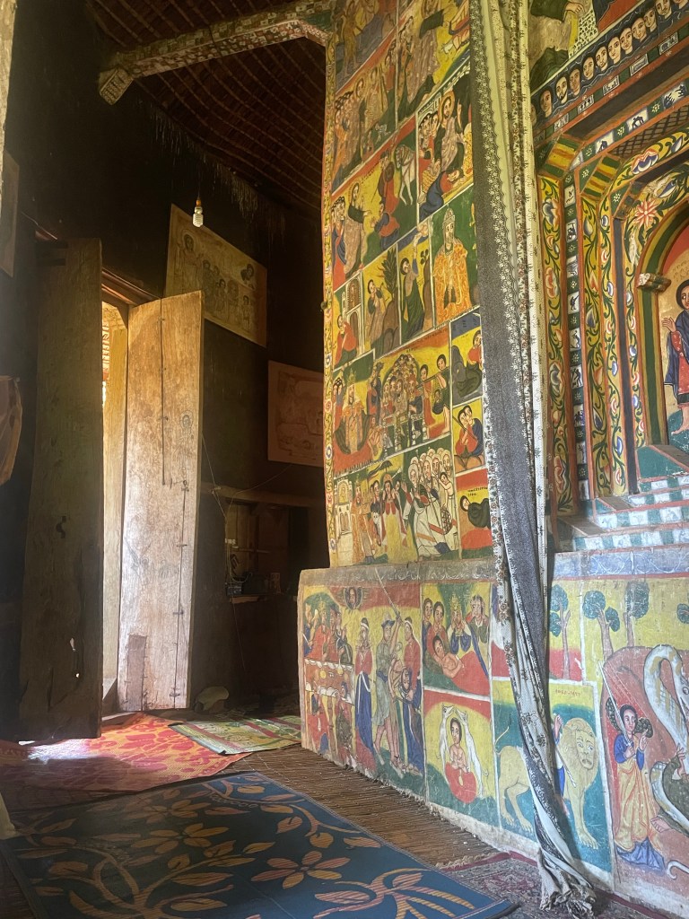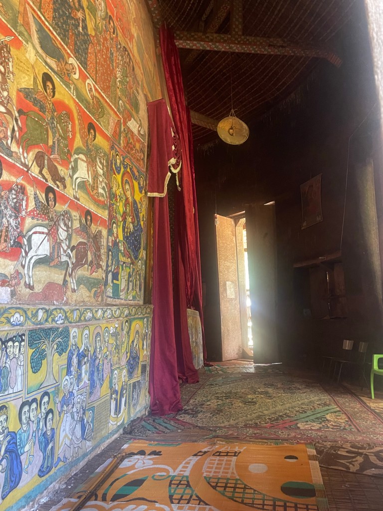 Como en todas las iglesias ortodoxas que hemos visto hasta ahora, está totalmente pintada. Los murales fueron pintados sobre telas de algodón que, después, se pegaron a las paredes de barro y paja del templo. Grandes cortinas ocultan la parte sagrada y el Tabot. Esta tiene el tejado reformado, normalmente es de de paja o Teff.