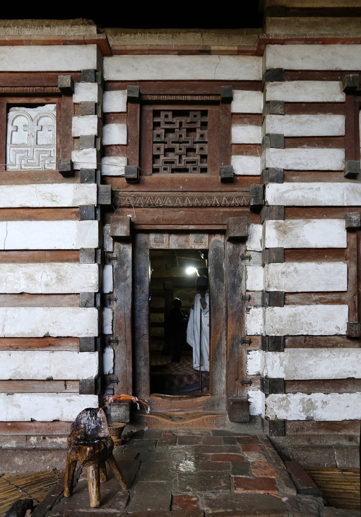 A unos 40 kilómetros de Lalibela se encuentra la iglesia de Yemrehane Krestos, construida en el interior de una cueva en el siglo XI. Esta iglesia es brutal, con un aire a la catedral de Florencia (ya sé que no tiene nada que ver) alternando franjas de enlucido blanco con la madera oscura.