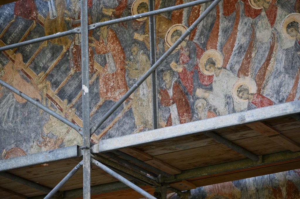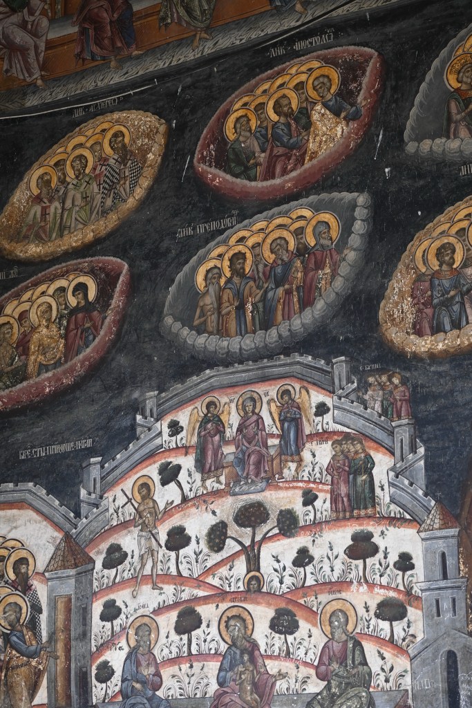 Una de las pinturas más famosas del Monasterio de Sucevita es « La escalera de la virtud¨ en la pared exterior del norte, que representa las 30 escaleras del infierno hasta el paraíso. Estaba con andamios. 😫 pero se podía apreciar la escalera.