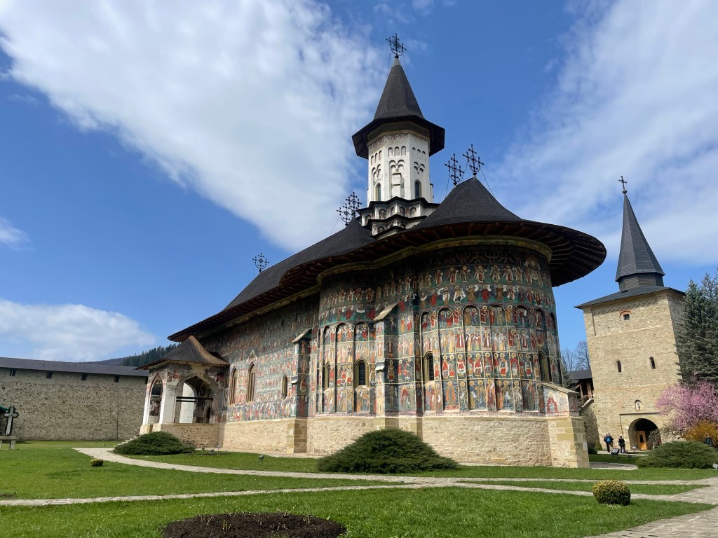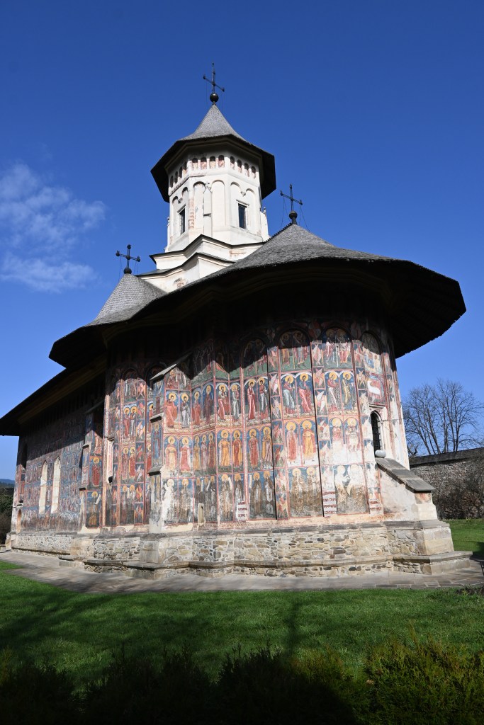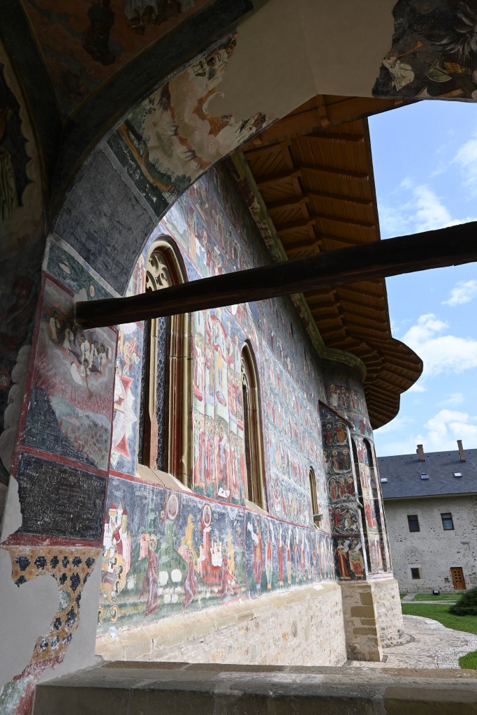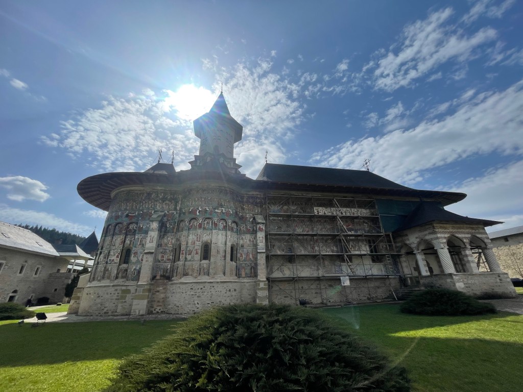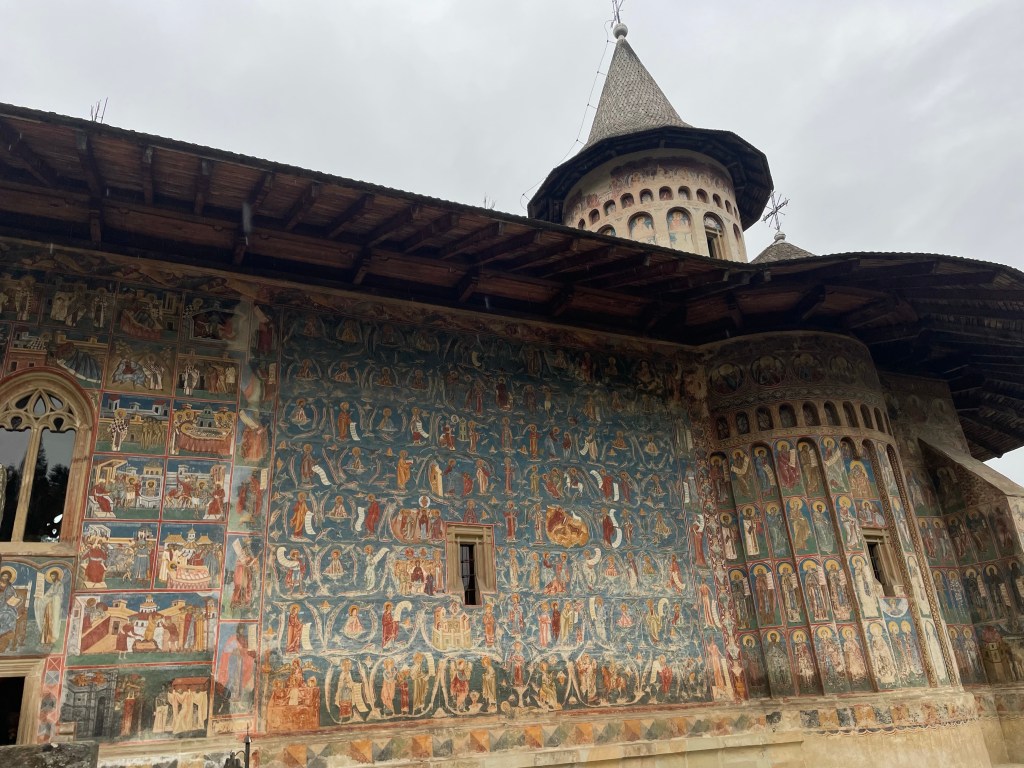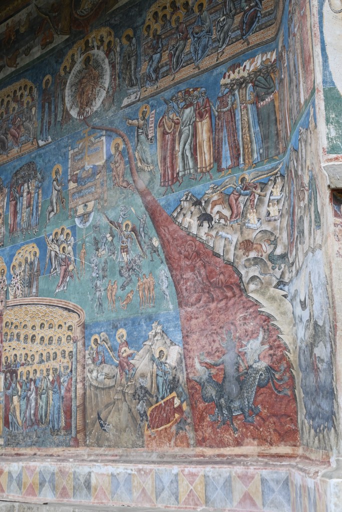 Visitamos el monasterio Voroneț justo antes de cerrar. A este monasterio en concreto, se le conoce como la Capilla Sixtina del este de Europa, con impresionantes pinturas al fresco del juicio Universal y la resurrección de los muertos (en el exterior oeste). Es el más pequeño y el color predominante es el azul, conocido en Rumanía como «azul de Voroneț.