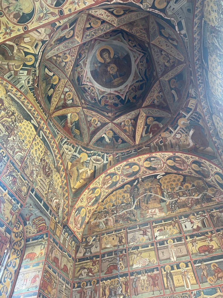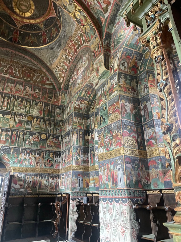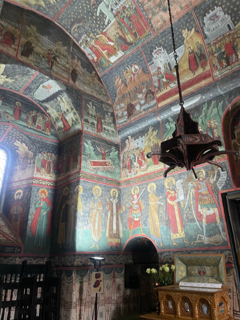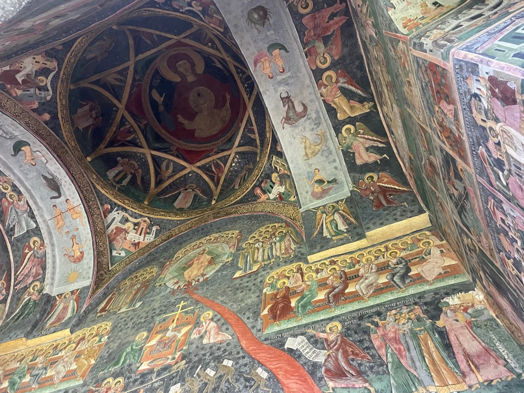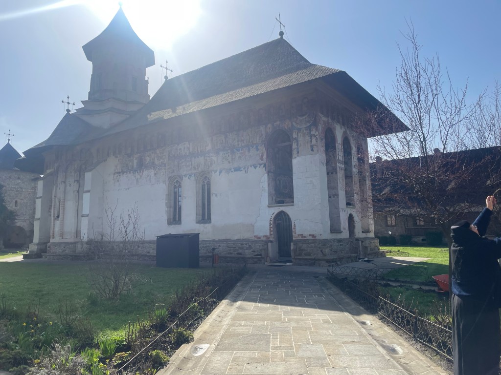 Visitamos el monasterio Voroneț justo antes de cerrar. A este monasterio en concreto, se le conoce como la Capilla Sixtina del este de Europa, con impresionantes pinturas al fresco del juicio Universal y la resurrección de los muertos (en el exterior oeste). Es el más pequeño y el color predominante es el azul, conocido en Rumanía como «azul de Voroneț.
