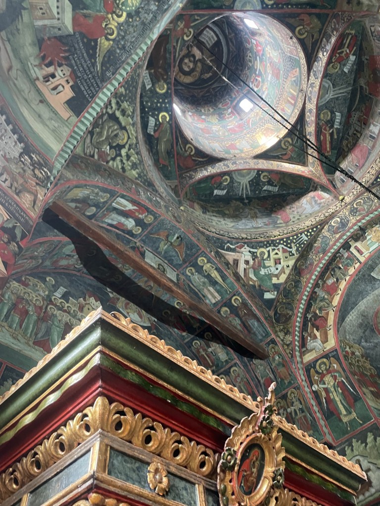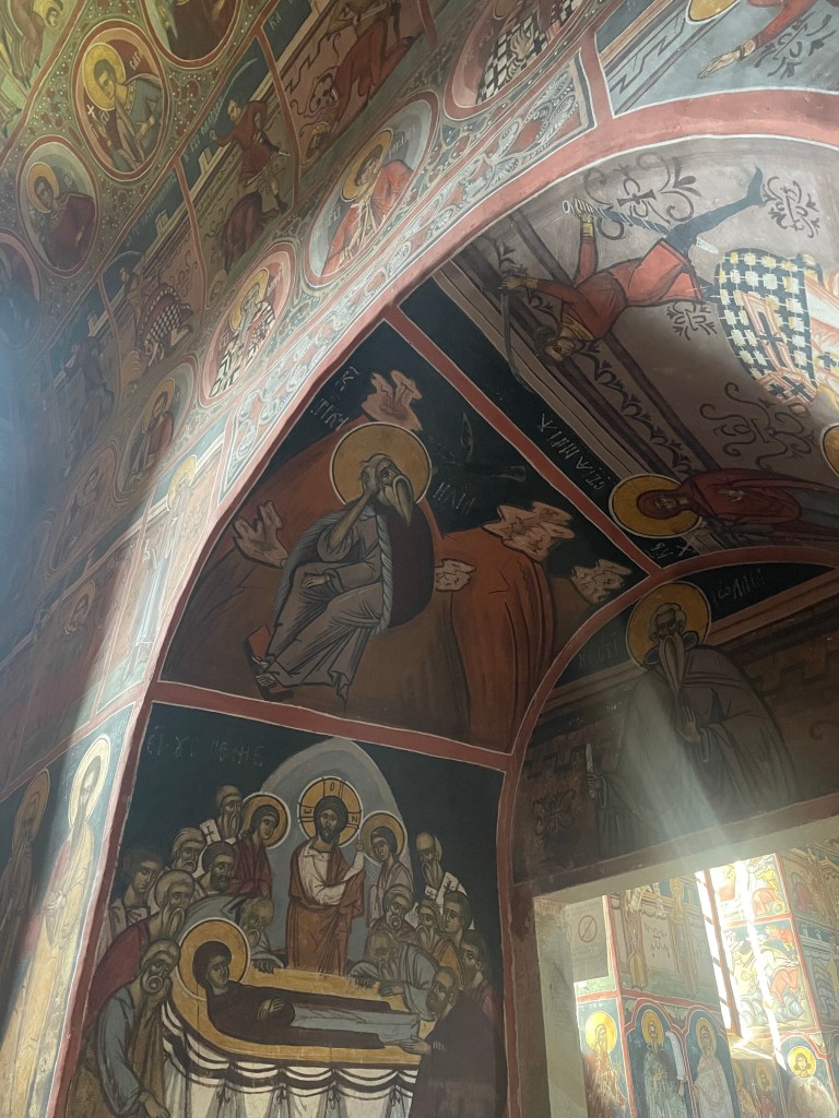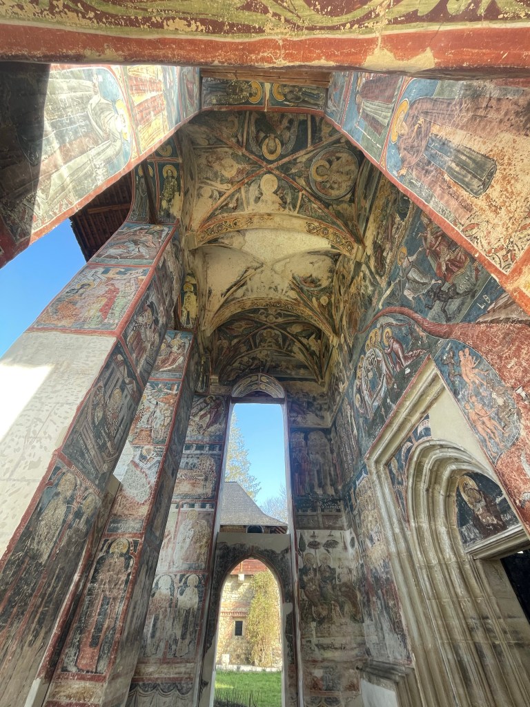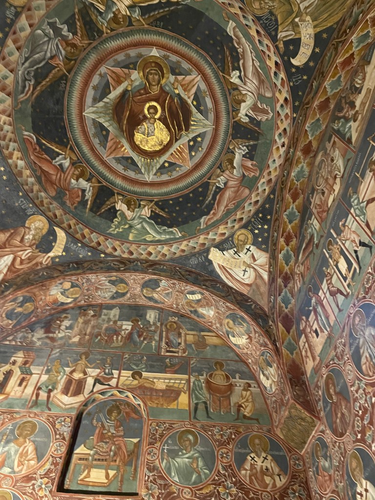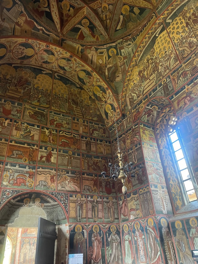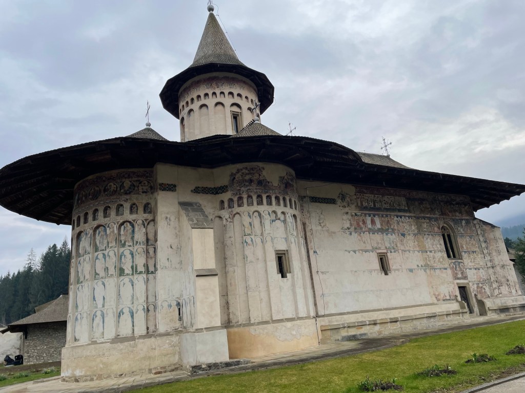 Visitamos el monasterio Voroneț justo antes de cerrar. A este monasterio en concreto, se le conoce como la Capilla Sixtina del este de Europa, con impresionantes pinturas al fresco del juicio Universal y la resurrección de los muertos (en el exterior oeste). Es el más pequeño y el color predominante es el azul, conocido en Rumanía como «azul de Voroneț.