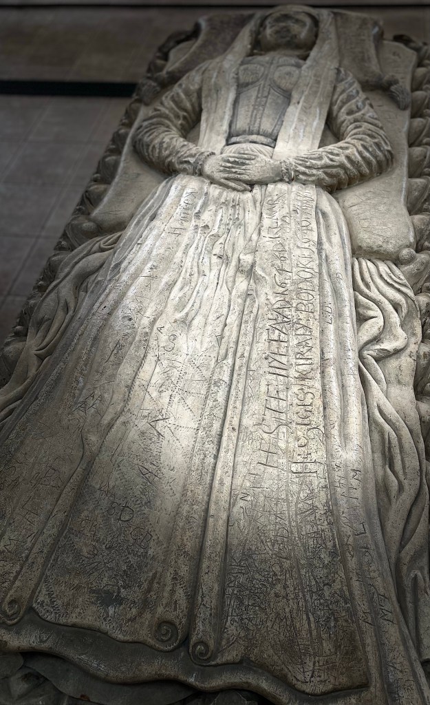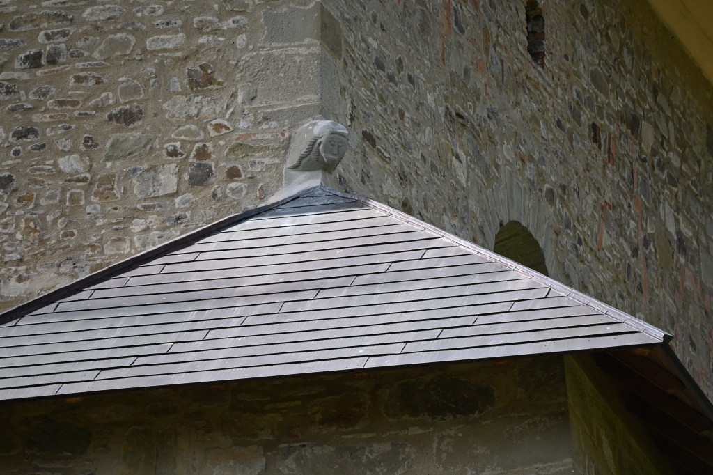 La leyenda cuenta que una mujer trabajó durante 2 años llevando piedras en su carro de bueyes para la construcción del monasterio, consiguió que esculpieran su rostro en una piedra negra del patio de la iglesia. Mucho zoom había que ponerle, pero si, ahí hay una cara esculpida.