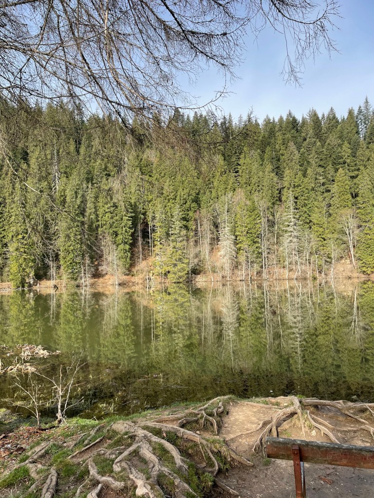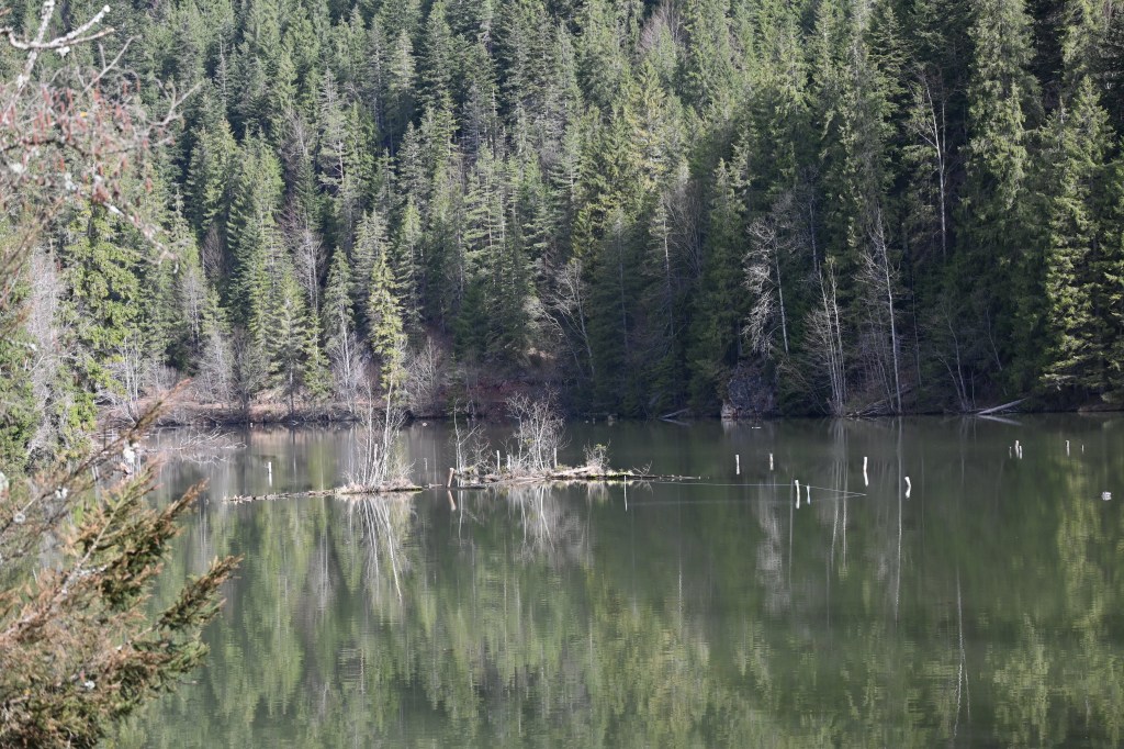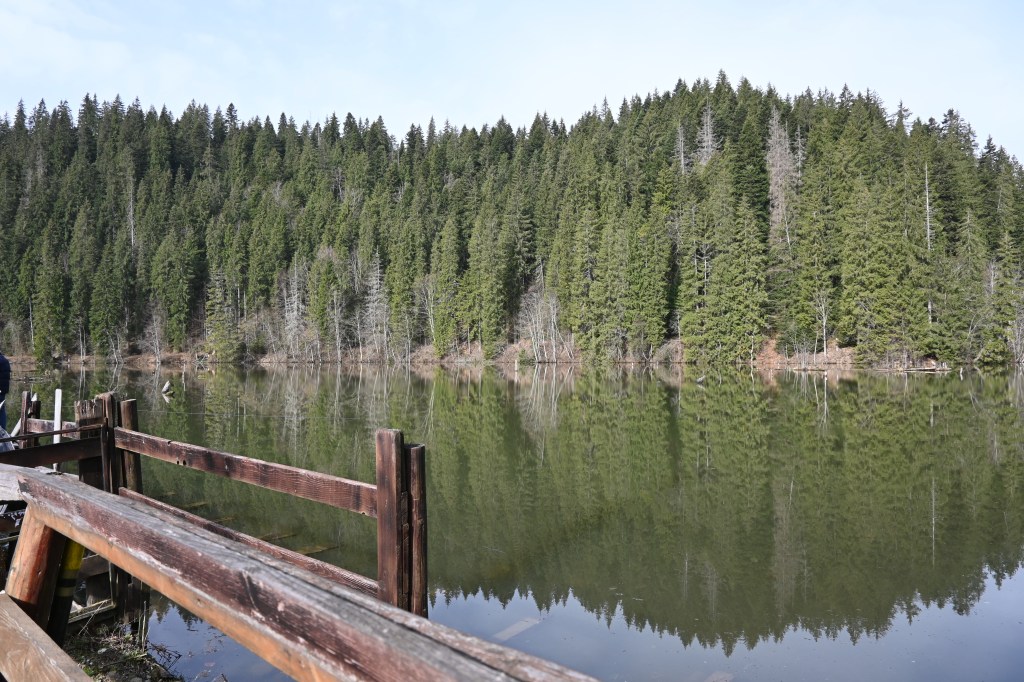 Una característica excepcional de este lago es el Bosque de Árboles Petrificados que hay en el centro del mismo. El lago es de formación muy reciente: en 1838, año de fuertes lluvias y terremotos, se desprendió una ladera de los Montes Ucigas, que están pegados al lago actualmente. La caída de rocas provocó el hundimiento del bosque de pinos y resultó en la inundación de este terreno. Y de ahí los restos de los árboles, no sé si se aprecia bien en las fotos.