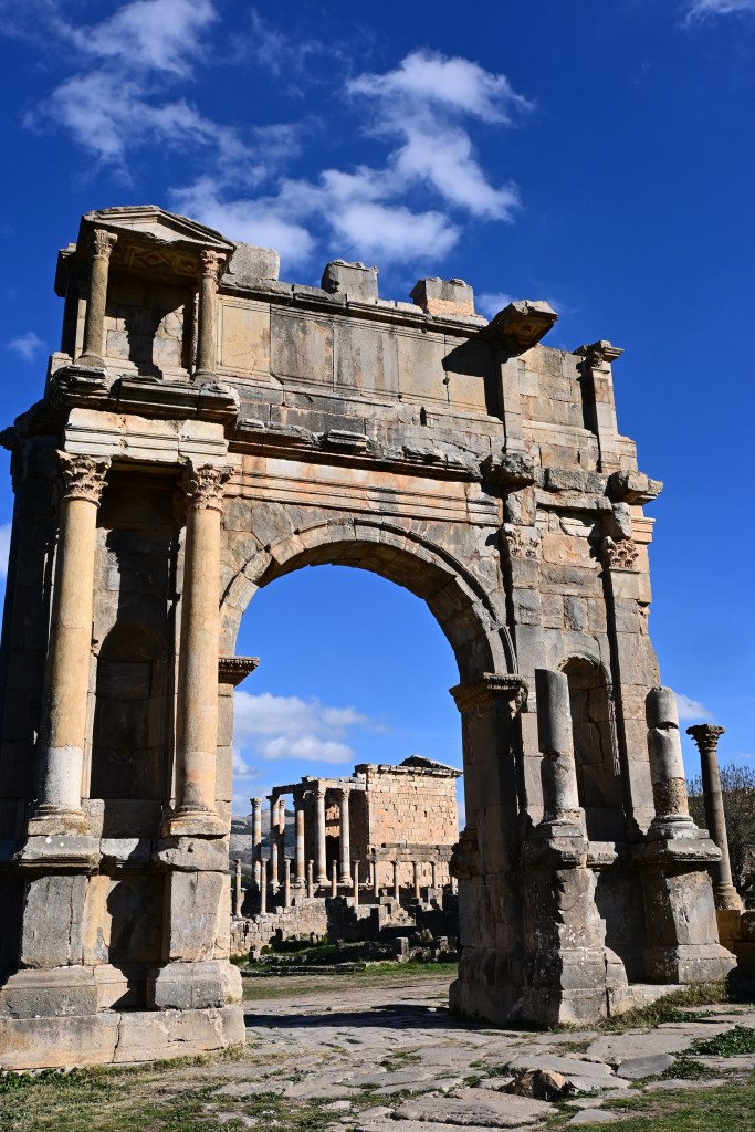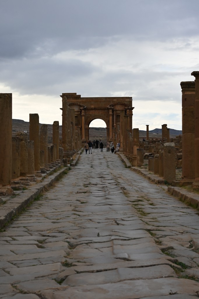 En el cruce de esta calle con el decumanus, si miramos al final, hacia el oeste, vemos uno de los hitos más impresionantes: el Arco de Trajano, arco triunfal que marcaba la entrada monumental a la ciudad desde la carretera que venía de la vecina Lambaesis. Con 3 vanos y una altura de unos 12 m, nos recuerda que Timgad no era un simple poblado.