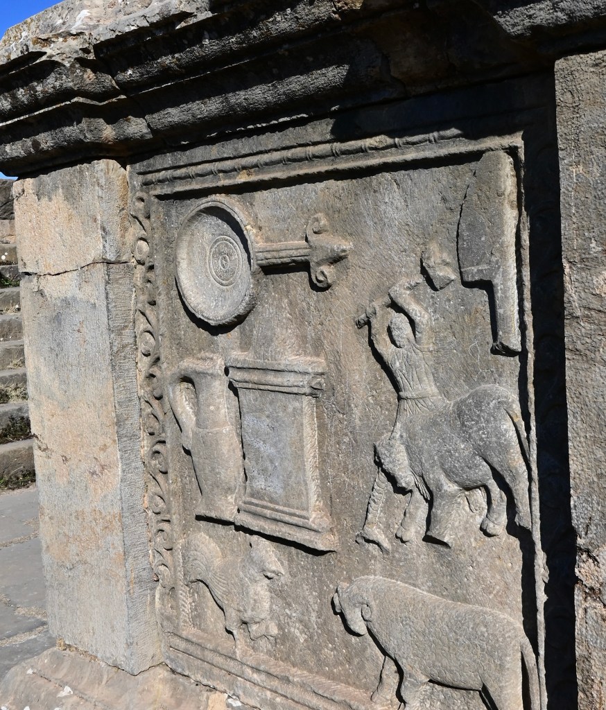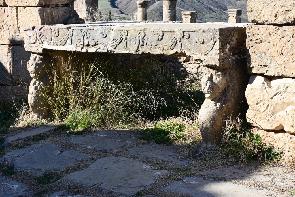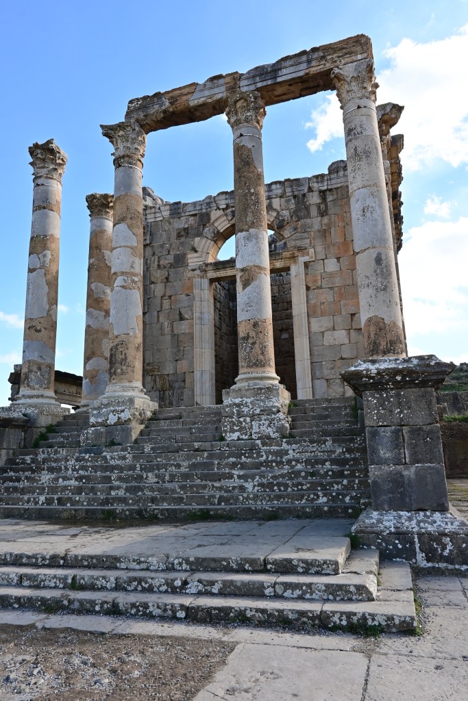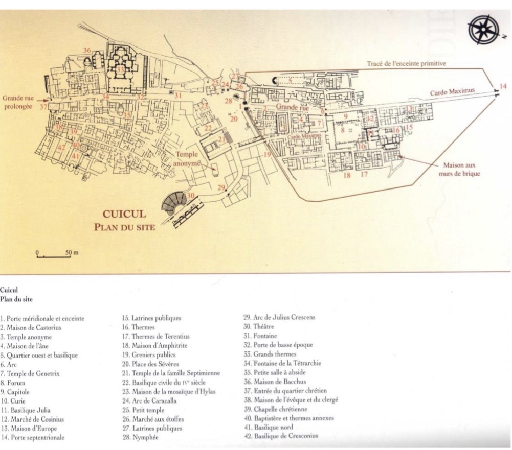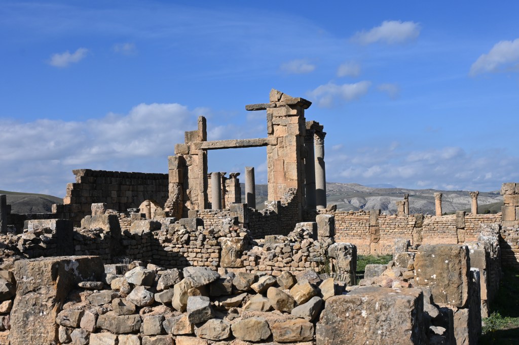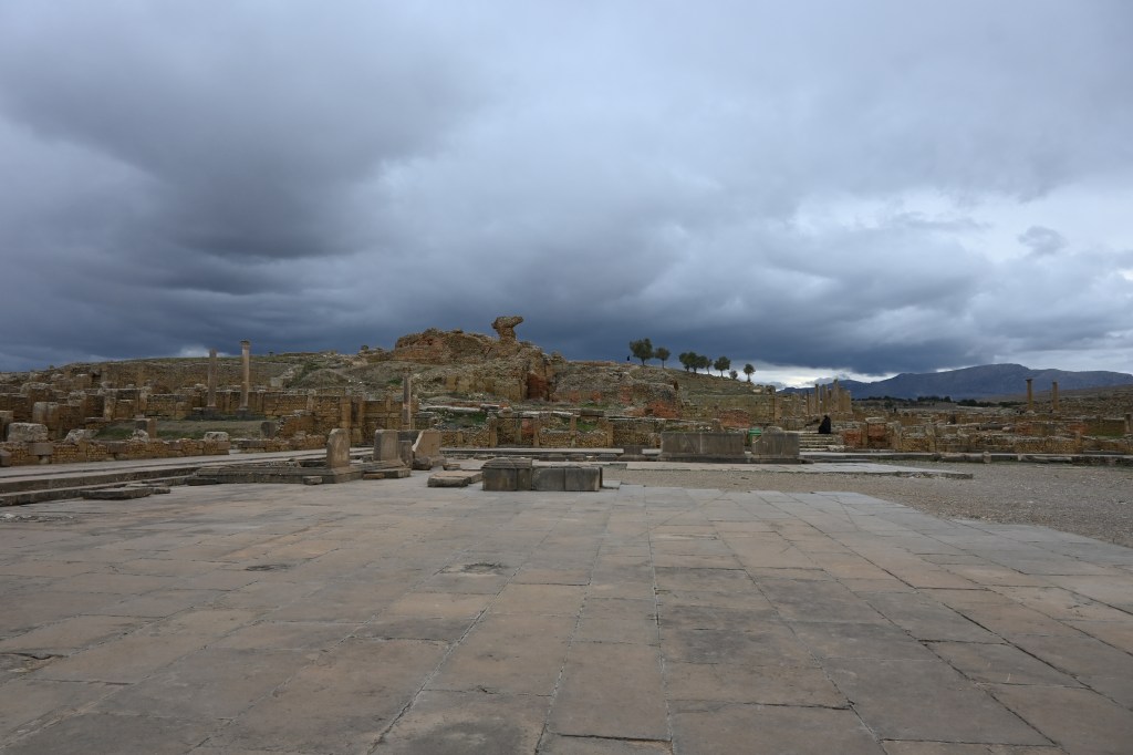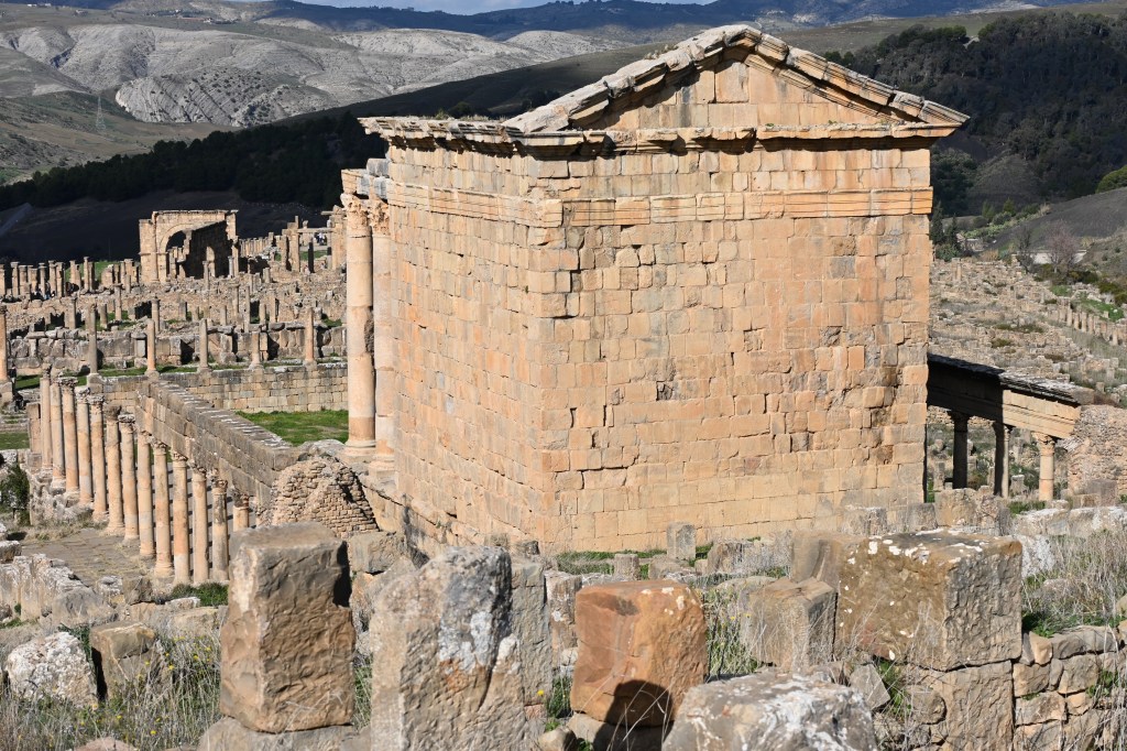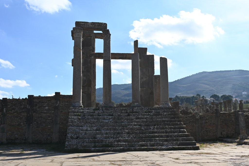 El foro aún guarda algunas columnas y junto a este, el capitolio, el centro religioso y político de Cuicul, en el centro, un altar con un bajorrelieve tallado que representa diversos elementos asociados con rituales de sacrificio y por otro lado, la diosa alada de la agricultura.
