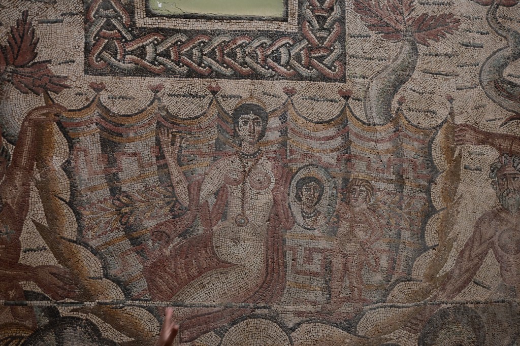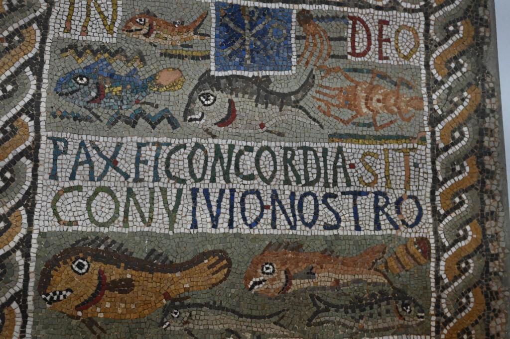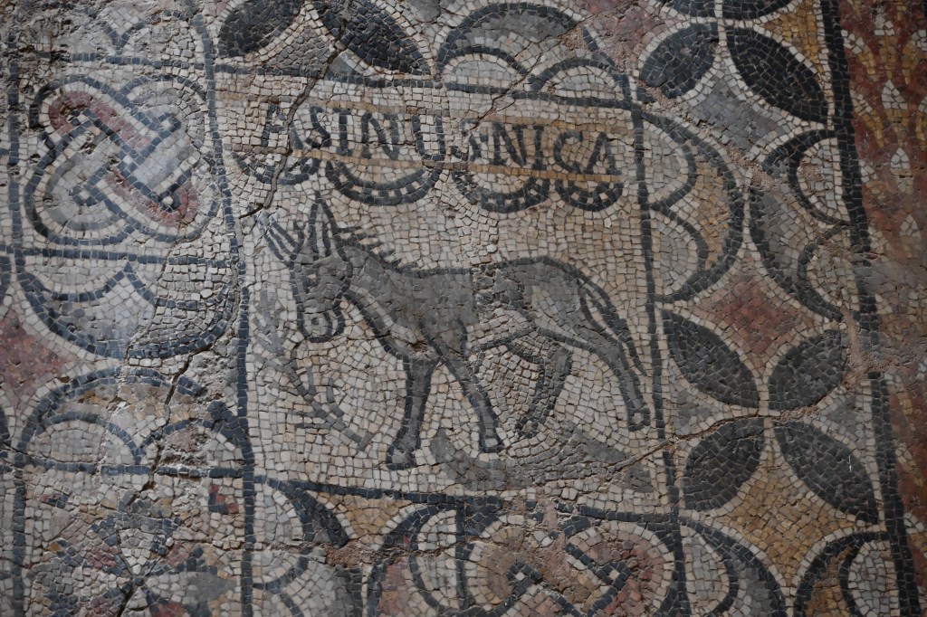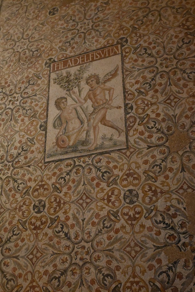 Debe su nombre a un mosaico, (este de aquí abajo) que se encontró en los baños o termas privadas, que también contaban con las 3 salas a diferentes temperaturas.