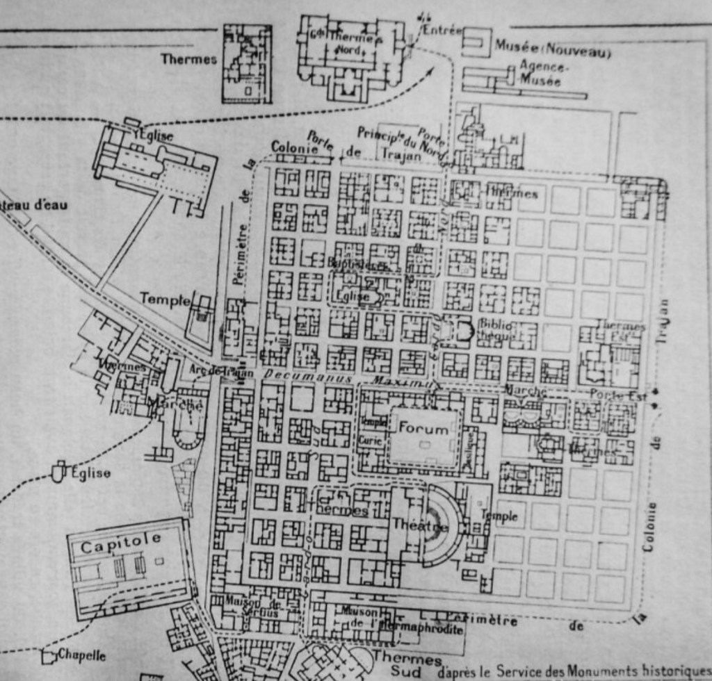 Las arenas del Sahara la cubrieron hasta su excavación en 1881. La ciudad, responde de manera, casi ideal, al esquema ortogonal romano, con los siguientes elementos clave: