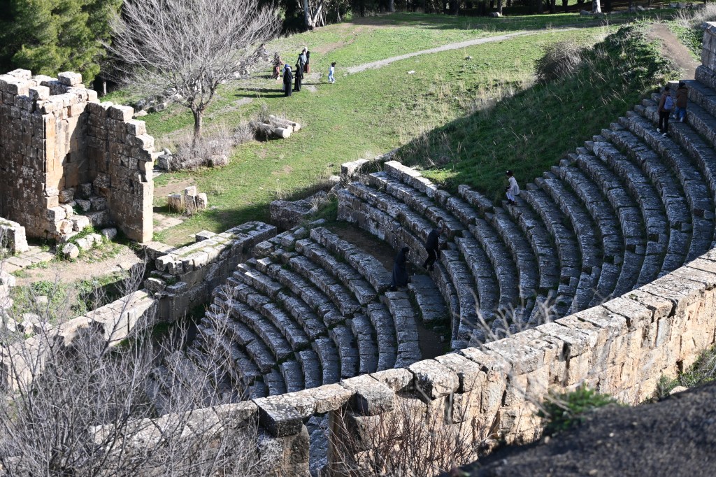 Excavado parcialmente en la ladera de una colina. La cávea semicircular —los graderíos— podía acoger a unas 3 500 personas. Los arqueólogos determinan la población aproximada de una ciudad según el tamaño del teatro.
