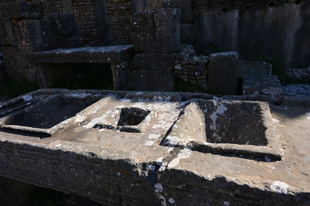 Las losas del suelo están tan bien colocadas que hoy todavía podemos ver las marcas redondas dejadas por las ruedas de carros hace casi dos milenios. A lo largo de toda la calzada corre en paralelo la red de saneamiento, las cloacas…y hacia adentro restos de casas, « Domus ».