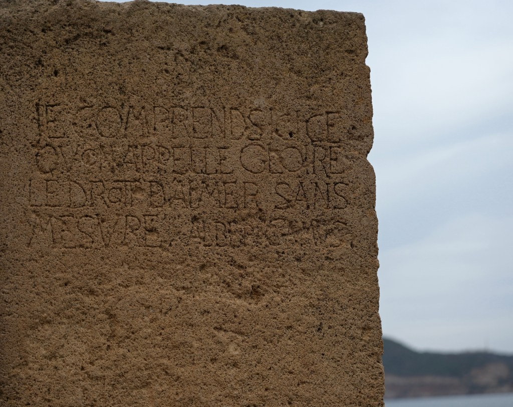 En medio de las ruinas, de tumbas y sarcófagos, una estela con un mensaje grabado en memoria del escritor: Je comprends ici ce qu’on appelle gloire: le droit d’aimer sans mesure. «Aquí comprendo lo que llaman gloria: el derecho a amar sin medida«