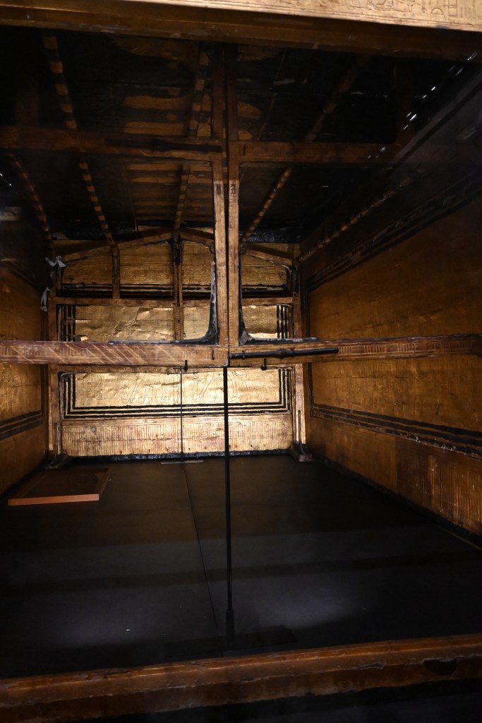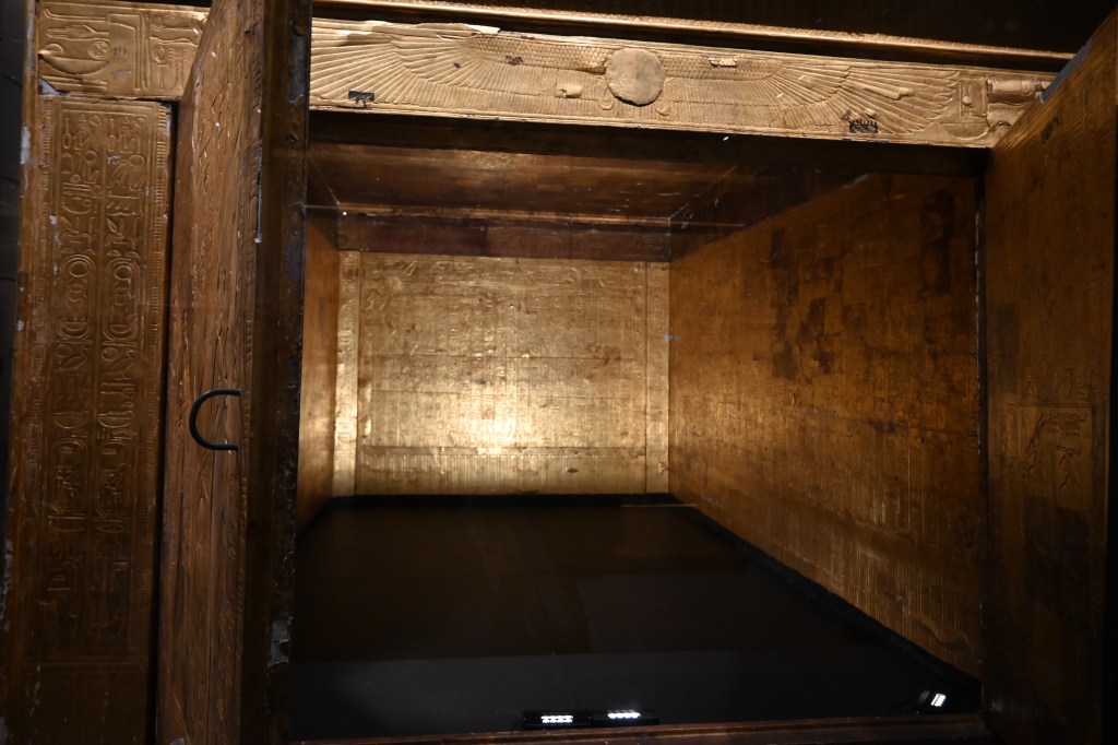 Tutankamón, son piezas clave del ajuar funerario del faraón. Están hechos de madera y cuero, recubiertos de pan de oro y piedras preciosas.